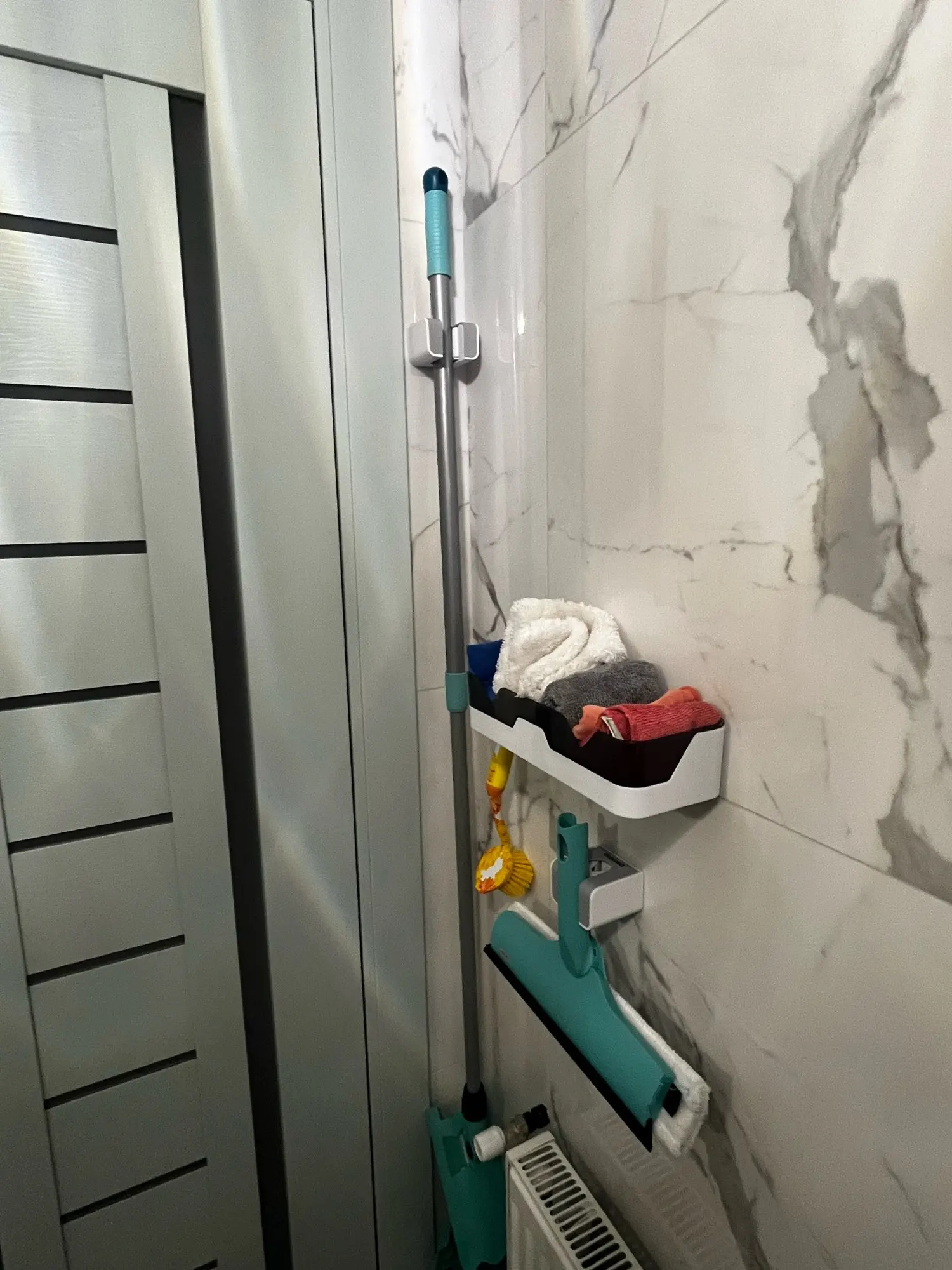 - Once the adhesive is fully set, you can easily hang your mops, brooms, and other cleaning tools. The design allows for easy hanging and retrieval, making your cleaning routine more efficient.