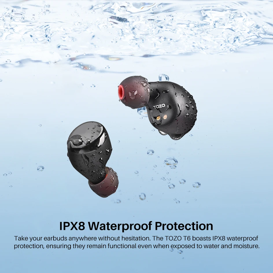 - Take your earbuds anywhere without hesitation. Additionally, the TOZO T6 boasts IPX8 waterproof protection, ensuring they remain functional even when exposed to water and moisture.