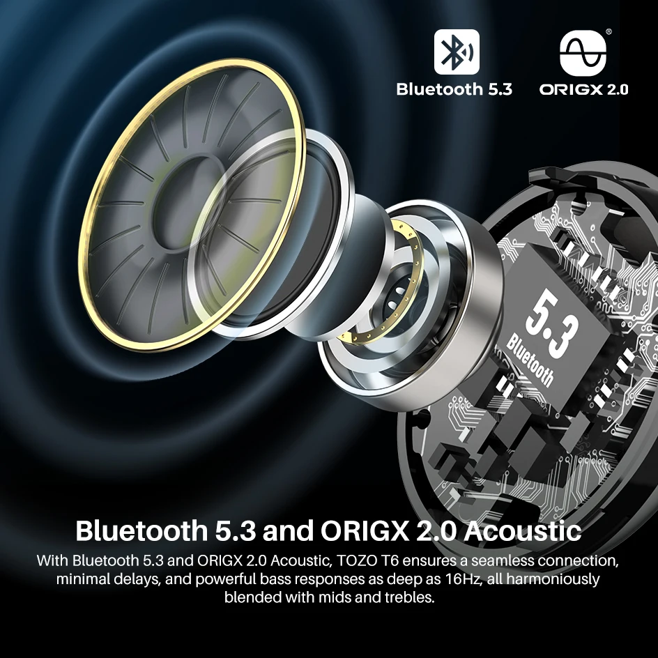 - With Bluetooth 5.3 and ORIGX 2.0 Acoustic, TOZO T6 ensures a seamless connection, minimal delays, and powerful bass responses as deep as 16Hz, all harmoniously blended with mids and trebles.