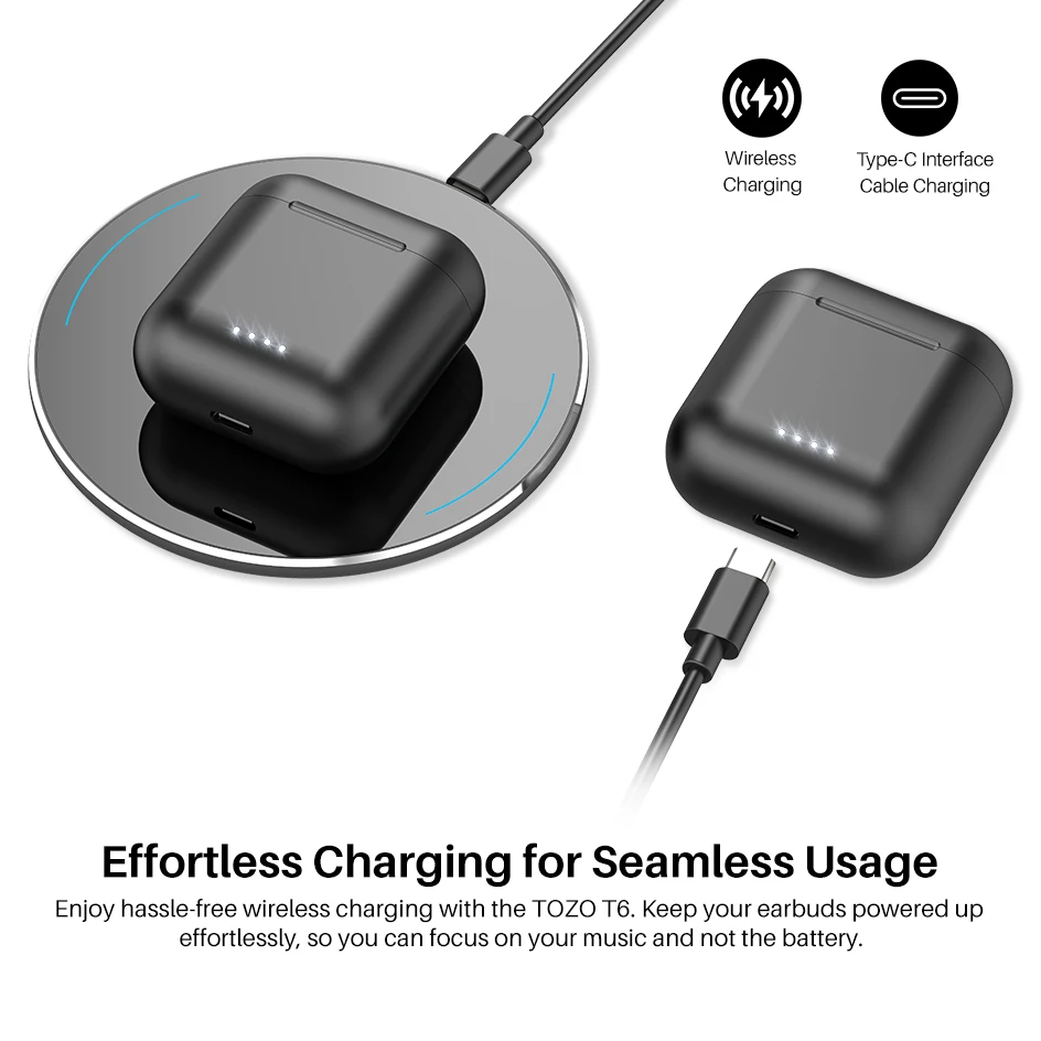 - Enjoy hassle-free wireless charging with the TOZO T6. So, keep your earbuds powered up effortlessly, so you can focus on your music and not the battery.