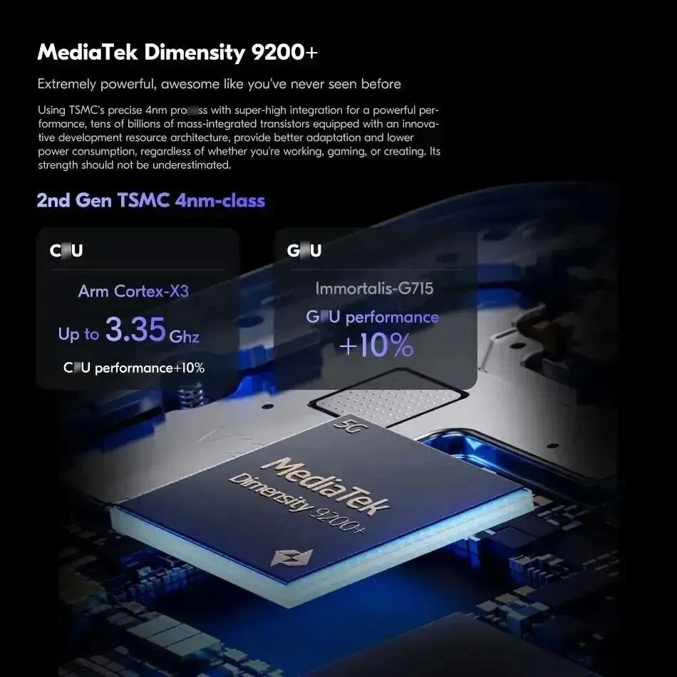 - MTK Dimensity 9200+: Fast and efficient performance for every task.